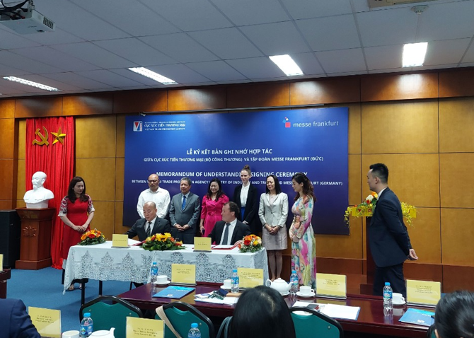Sáng nay (30/3), tại Hà Nội, Cục Xúc tiến thương mại(Bộ Công Thương) và Tập đoàn Messe Frankfurt (Cộng hòa Liên bang Đức) ký kết Biên bản ghi nhớ (MOU) về tăng cường hợp tác trong hoạt động xúc tiến thương mại.