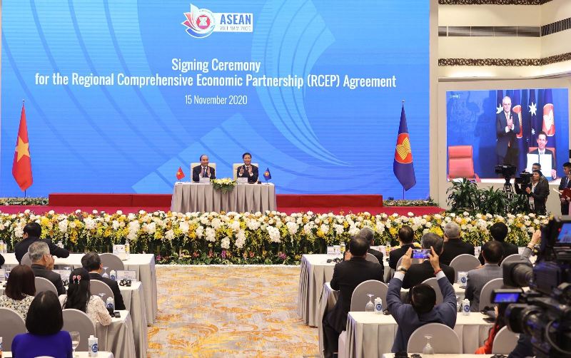 Thủ tướng Nguyễn Xuân Phúc, Chủ tịch ASEAN 2020 cùng các nhà lãnh đạo cấp cao chứng kiến Lễ ký Hiệp định Đối tác Kinh tế Toàn diện Khu vực RCEP, ngày 15/11. Ảnh minh họa: Thống Nhất/TTXVN |