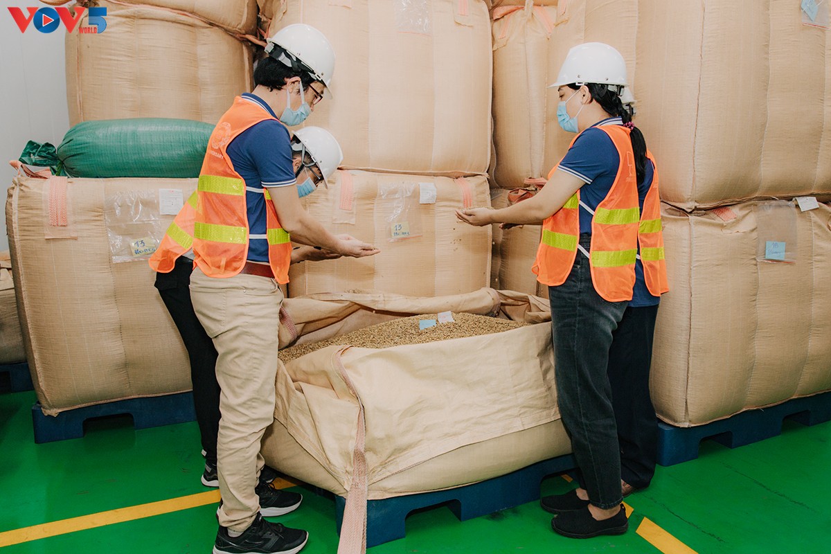Kiểm tra chất lượng cà phê trước khi đóng gói xuất khẩu. Ảnh: Hương Lý/VOV |