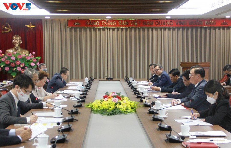 Bí thư Thành ủy, Trưởng đoàn đại biểu Quốc hội thành phố Hà Nội Đinh Tiến Dũng chủ trì tiếp Đại sứ Nhật Bản tại Việt Nam Yamada Takio. Ảnh: Nguyên Nhung/ VOV |