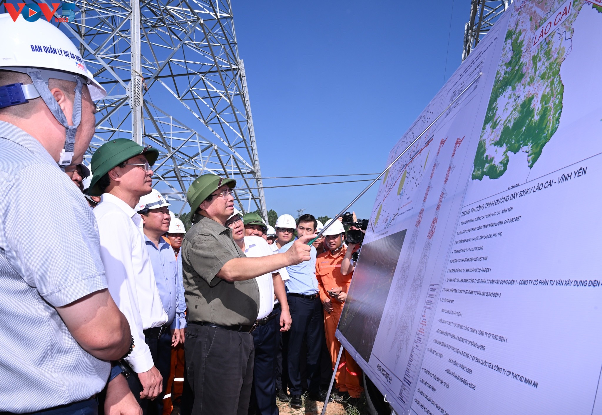 Thủ tướng Phạm Minh Chính đến kiểm tra Dự án Đường dây 500 kV Lào Cai - Vĩnh Yên. Ảnh: VOV |
