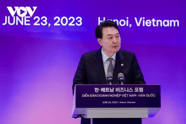 Phát biểu với cộng đồng doanh nghiệp hai nước, Tổng thống Hàn Quốc Yoon Suk Yeol nhấn mạnh hai nước cần nâng tầm quan hệ Việt Nam-Hàn Quốc lên tầm cao mới. Trong đó, phải nâng cao hơn nữa hoạt động giao thương, góp phần đạt mục tiêu đưa kim ngạch thương mại song phương lên 150 tỷ USD vào năm 2030. Việt Nam và Hàn Quốc cần tăng cường hợp tác về các lĩnh vực như chuyển đổi số, chuyển đổi năng lượng. Tổng thống Hàn Quốc hy vọng doanh nghiệp hai nước sẽ tiếp tục có nhiều dự án hợp tác cụ thể, thiết thực, hiệu quả.