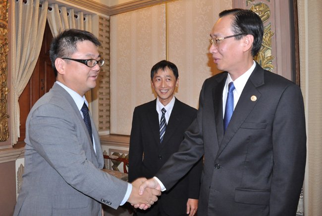 | Phó Chủ tịch UBND TPHCM Lê Thanh Liêm bắt tay với ông Amano Shynia (trái), Trưởng Văn phòng Jetro tại Quảng Châu, Trung Quốc tại buổi đón tiếp. Ảnh: Xuân Đặng |