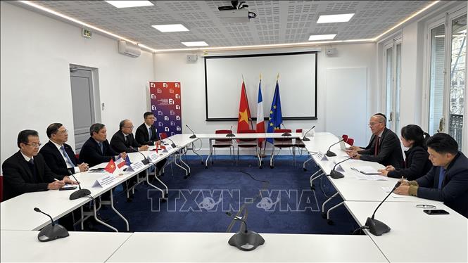 Quang cảnh buổi làm việc giữa lãnh đạo của ba tỉnh Quảng Bình, Nam Định và An Giang với lãnh đạo Nghiệp đoàn các Doanh nghiệp của Pháp tại trụ sở MEDEF International. Ảnh: TTXVN |