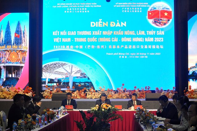 Diễn đàn kết nối giao thương xuất nhập khẩu nông, lâm, thủy sản Việt Nam - Trung Quốc năm 2023 diễn ra tại thành phố Móng Cái, Quảng Ninh chiều 30/11. Ảnh: VOV |