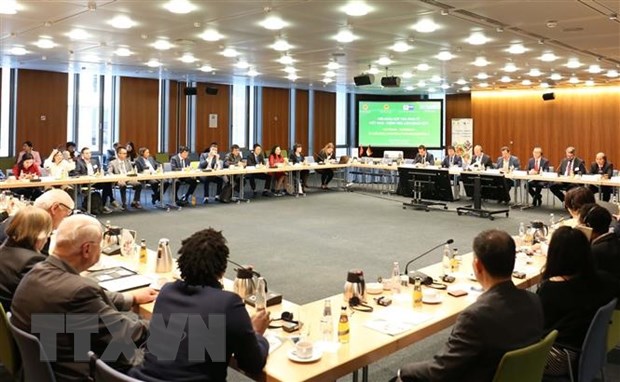 Quang cảnh Hội nghị Hợp tác Kinh tế Việt Nam-Đức được tổ chức tại trụ sở Hiệp hội các phòng Thương mại và Công nghiệp Đức (DIHK) ở Berlin, Đức - Ảnh: Mạnh Hùng/TTXVN |