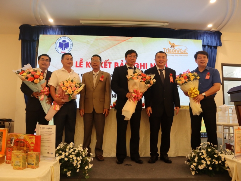 Ông Bùi Băng Sơn (thứ 2 bên phải) có nhiều tâm huyết với nghề nuôi yến và sản xuất các sản phẩm từ tổ yến |