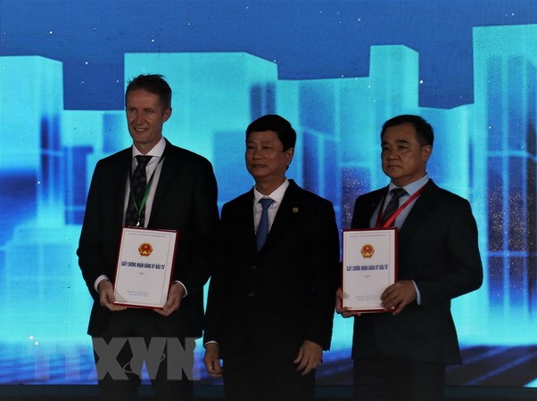 Chủ tịch UBND tỉnh Bình Dương Võ Văn Minh trao Giấy chứng nhận đầu tư cho đại diện Tập đoàn LEGO và chủ đầu tư Khu công nghiệp VSIP3. Ảnh: Chí Tưởng/TTXVN |