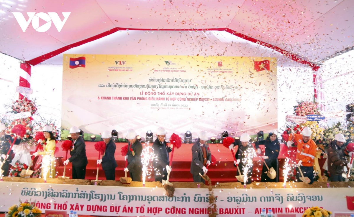 Lễ động thổ và khánh thành khu văn phòng điều hành tổ hợp công nghiệp Bauxit – Alumin Dakcheung. Ảnh: PV/ VOV-Vientiane |