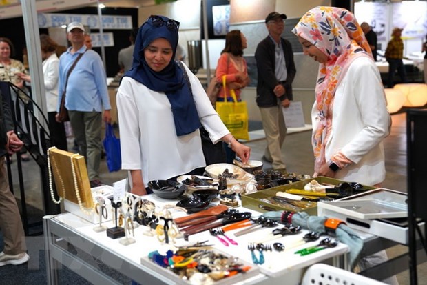 Khách quốc tế tìm hiểu các sản phẩm thủ công mỹ nghệ của Việt Nam. Ảnh: Lê Đạt/TTXVN |