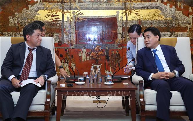 Chủ tịch UBND TP Hà Nội Nguyễn Đức Chung tiếp ông Shimizu Akira, Trưởng đại diện JICA tại Việt Nam. Ảnh: Lâm Khánh/TTXVN |