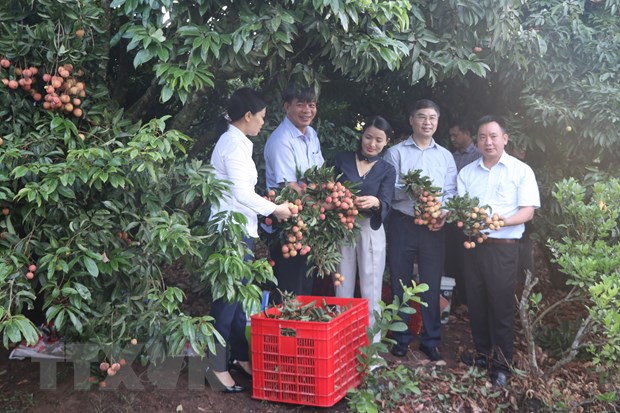 Cơ quan chức năng kiểm tra việc thu hái vải thiều ở thôn Lại Xá 2, xã Thanh Thủy, huyện Thanh Hà xuất khẩu đi Nhật Bản. (Ảnh: TTXVN) |