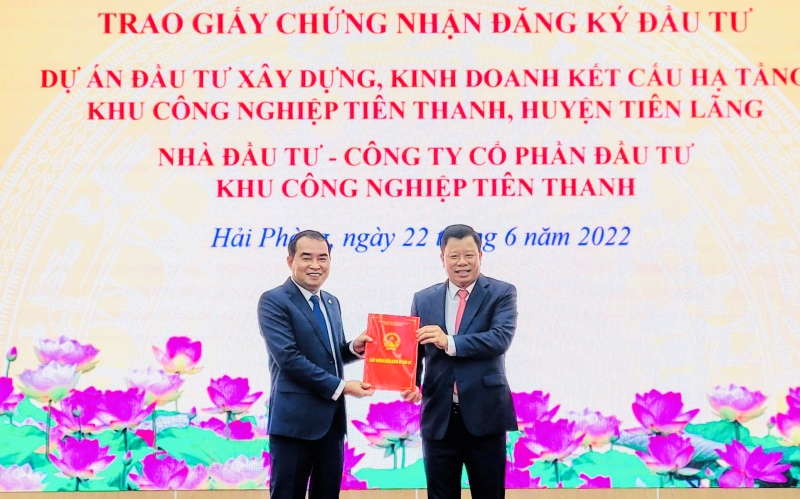 Chiều 22/06, Ban quản lý Khu kinh tế Hải Phòng tổ chức trao Giấy chứng nhận đăng ký đầu tư cho Dự án đầu tư xây dựng và kinh doanh kết cấu hạ tầng Khu công nghiệp Tiên Thanh, huyện Tiên Lãng và các dự án trong Khu công nghiệp, Khu kinh tế Hải Phòng tháng 6 năm 2022.