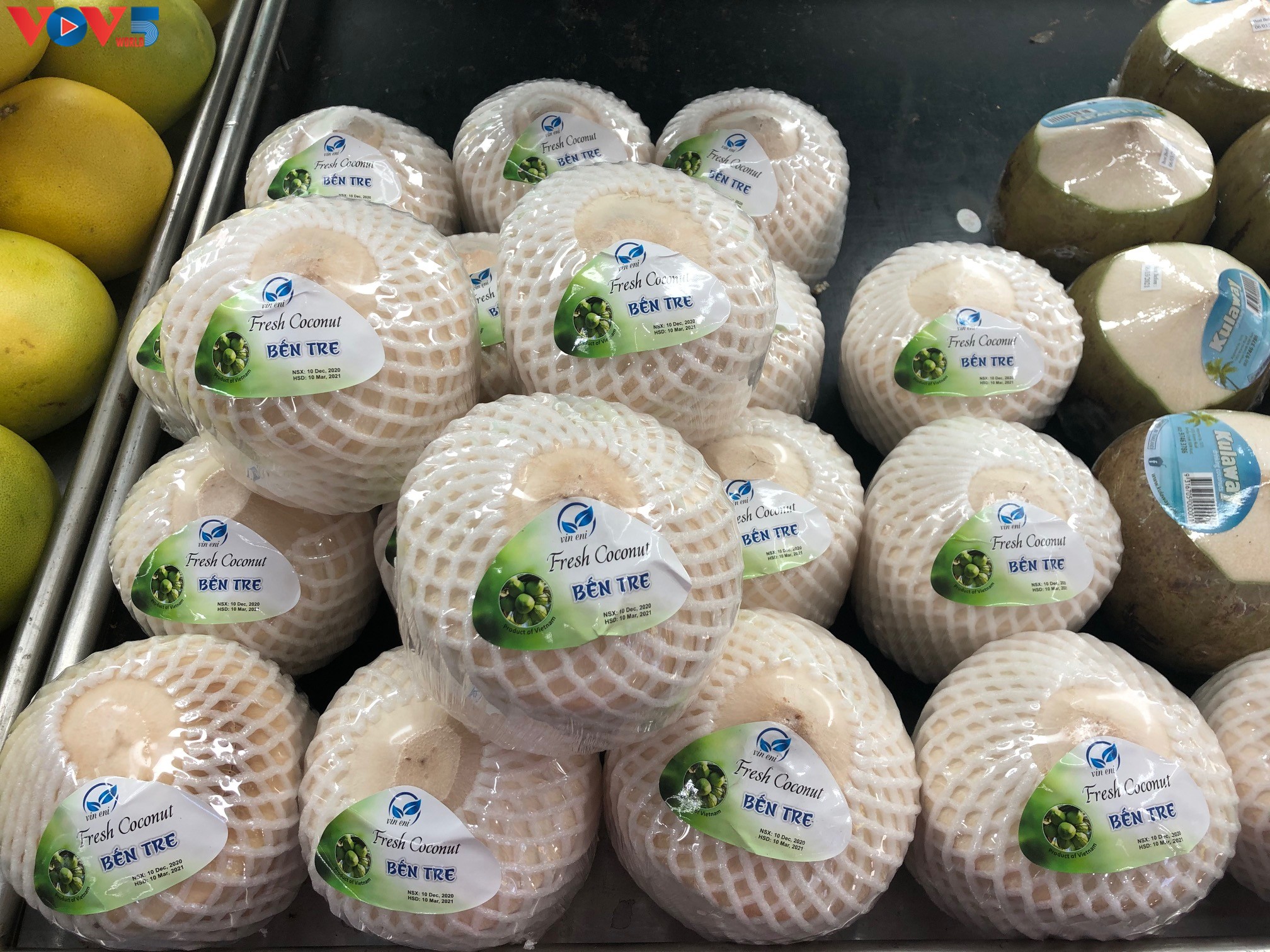 Dừa Bến Tre được bày bán tại siêu thị Hồng Phước tại thành phố Sydney. Nguồn: VOV |