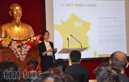 | Bà Nguyễn Thị Sinh, phụ trách hợp tác quốc tế của câu lạc bộ doanh nhân Việt Nam – Cam pu chia – Lào – Pháp, trình bày tham luận về các hoạt động xúc tiến thương mại của câu lạc bộ. Ảnh:baotintuc.vn |