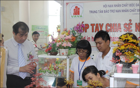 | Sản phẩm hoa nhựa của Hội Nạn nhân chất độc da cam đi ô xin Đà Nẵng được trưng bày tại hội chợ |