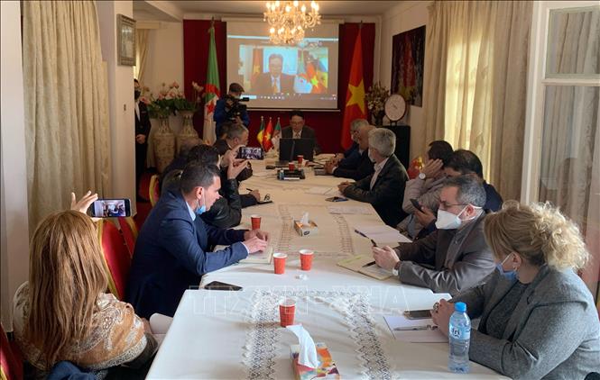 Quang cảnh Hội nghị giao thương trực tuyến về khai thác tiềm năng hợp tác thương mại và đầu tư Việt Nam – Algeria - Senegal 2021 tại đầu cầu ở thủ đô Algiers. Ảnh: Tấn Đạt/TTXVN |