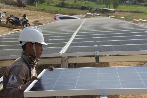 Thi công Nhà máy điện mặt trời Điện lực miền Trung tại huyện Cam Lâm, tỉnh Khánh Hòa. - Ảnh: EVNCPC |