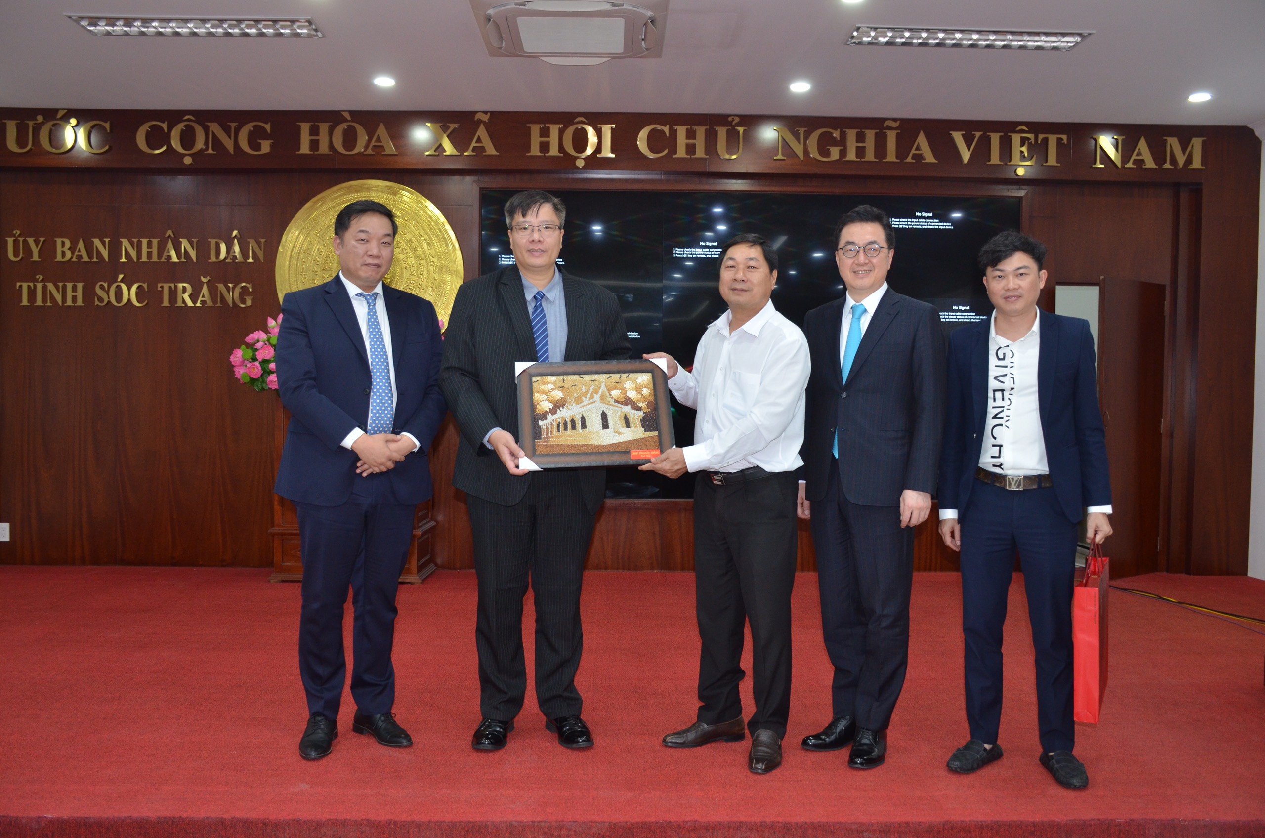 Ông Trần Hải Linh, Chủ tịch Hiệp hội VKBIA, (thứ hai từ trái sang) nhận quà lưu niệm của lãnh đạo UBND tỉnh Sóc Trăng. |
