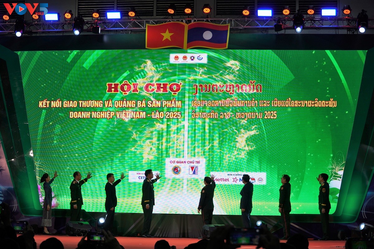 Các đại biểu thực hiện nghi thức khai mạc Hội chợ kết nối giao thương và quảng bá sản phẩm doanh nghiệp Việt Nam - Lào năm 2025. Ảnh: PV/VOV-Vientiane |