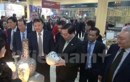 | Thứ trưởng Đỗ Thắng Hải và Đại sứ Nguyễn Thanh Sơn thăm gian hàng gốm Bát Tràng. (Ảnh: Duy Trinh-Quang Vinh/Vietnam+) |