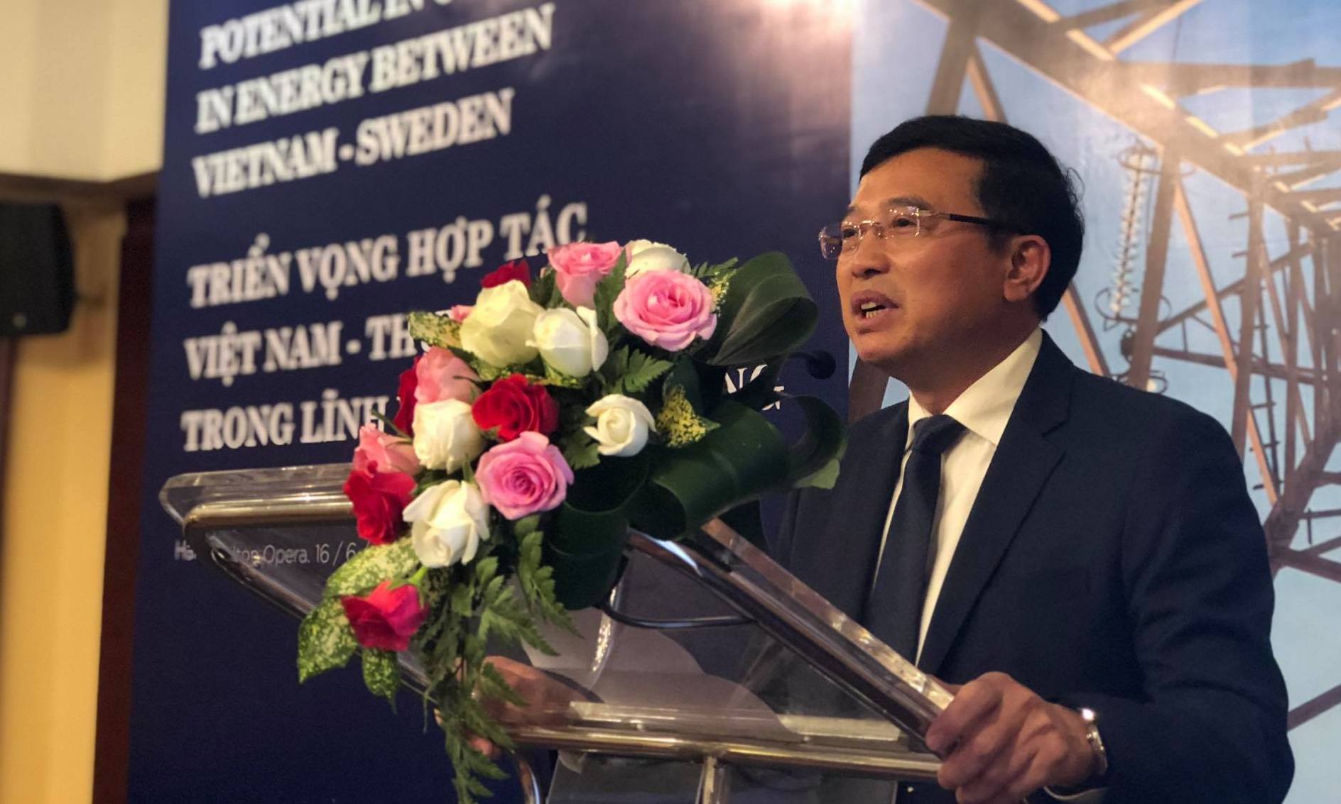 Thứ trưởng Bộ Công thương Hoàng Quốc Vượng phát biểu tại hội thảo "Triển vọng hợp tác Việt Nam- Thụy Điển trong lĩnh vực năng lượng tái tạo". - Ảnh Hà Linh |