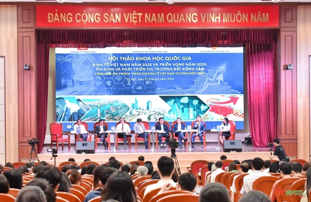Sáng nay (21/4), Trường Đại học Kinh tế Quốc dân phối hợp cùng Ban Kinh tế Trung ương, Ủy ban Kinh tế của Quốc hội tổ chức Hội thảo Khoa học Quốc gia để đánh giá kinh tế Việt Nam năm 2022 và triển vọng năm 2023, đồng thời công bố ấn phẩm "Đánh giá Kinh tế Việt Nam thường niên 2022" của Trường Đại học Kinh tế Quốc dân. Hội thảo, trên cơ sở phân tích tình hình kinh tế thế giới và trong nước, đưa ra khuyến nghị chính sách chung cho năm 2023, trong đó đề xuất nhóm giải pháp khơi thông nguồn vốn cho thị trường bất động sản