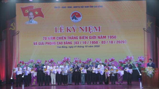L ãnh đạo Tỉnh Cao Bằng tặng huy hiệu Vì sự nghiệp xây dựng và phát triển tỉnh Cao Bằng cho các nhân có nhân có nhiều đóng góp trong sự nghiệp xây dựng và phát triển tỉnh Cao Bằng trong lễ kỷ niệm 70 năm Chiến thắng Biên giới năm 1950 - Giải phóng Cao Bằng (3/10/1950 - 3/10/2020). - Ảnh: Chu Hiệu/TTXVN |