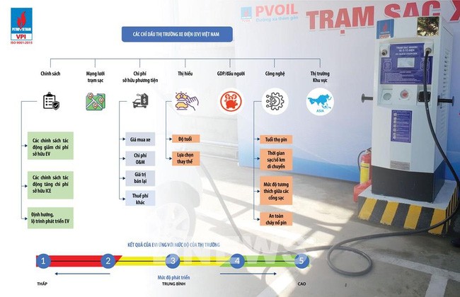 Theo kết quả nghiên cứu của VPI, chỉ số EVI của Việt Nam trong Quý III/2021 đạt 1,6/5 điểm (tương ứng với 32%) thông qua đánh giá các chỉ dấu gồm: chính sách, mạng lưới trạm sạc, chi phí sở hữu phương tiện (giá xe, chi phí vận hành bảo dưỡng, giá trị bán lại, thuế phí khác), thị hiếu (độ tuổi, lựa chọn thay thế), GDP/đầu người, công nghệ (tuổi thọ pin, thời gian sạc/số km di chuyển và mức độ tương thích giữa các cổng sạc của các hãng xe) và thị trường EV khu vực.