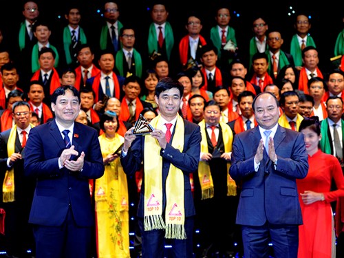 | Phó Thủ tướng Nguyễn Xuân Phúc và Bí thư Thứ nhất T.Ư Đoàn Nguyễn Đắc Vinh trao giải thưởng cho TOP 10 doanh nghiệp - Ảnh: Xuân Tùng/ BáoTiền Phong |