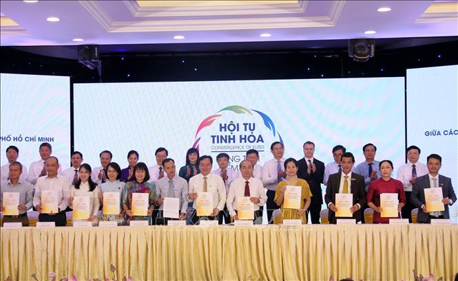 Đại diện 29 doanh nghiệp ký kết hợp tác phát triển du lịch. Ảnh: Văn Tý/TTXVN |