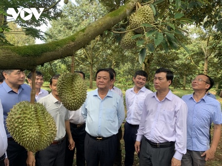 Bộ trưởng Lê Minh Hoan thăm vùng trồng sầu riêng đã được cấp mã số vùng trồng tại huyện Krông Pắk, tỉnh Đắk Lắk. Ảnh: Công Bắc/ VOV |