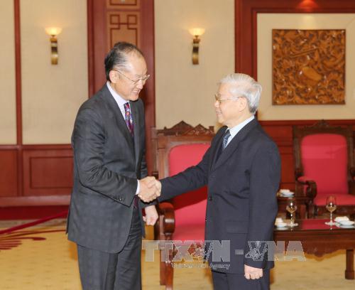 | Tổng Bí thư Nguyễn Phú Trọng tiếp ông Jim Yong Kim, Chủ tịch Ngân hàng Thế giới (WB) đang thăm và làm việc tại Việt Nam. Ảnh: Trí Dũng – TTXVN |