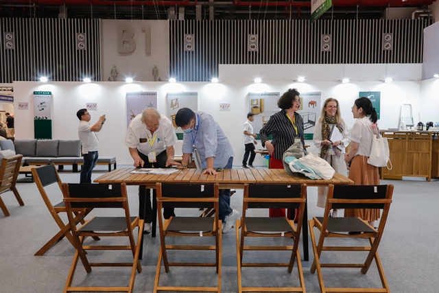 Khách nước ngoài tìm hiểu về sản phẩm tại Hội chợ triển lãm đồ gỗ và nội-ngoại thất lần thứ 14 diễn ra hồi tháng 3 năm nay tại TP.HCM. Ảnh: BTC |