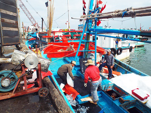 Tại các cảng cá tại tỉnh Khánh Hòa tấp nập tàu vào ra. Những con tàu vừa bán hết cá đã nhanh chóng lấy đá cây, nhiên liệu, lương thực thực phẩm để tiếp tục ra khơi. Cận Tết, giá cá tăng cao so với ngày thường, còn giá dầu thì lại giảm sâu nên các ngư dân rất phấn khởi. Sau khi trừ các chi phí, mỗi ngư dân đi bạn được chia từ 8 đến 10 triệu đồng mỗi chuyến biển, có tiền lo Tết sớm cho gia đình. Ông Đỗ Trung Hiệp, Phó Giám đốc Trung tâm quản lý và khai thác các công trình thủy sản tỉnh Khánh Hòa, cho biết tỉnh này có khoảng 1.000 tàu cá đánh bắt xa bờ. Năm nay, hầu hết các tàu hoạt động hiệu quả. Tết này, lượng tàu ra khơi tăng hơn năm trước. 5 cảng cá do Trung tâm quản lý đều hoạt động 24/24 để phục vụ ngư dân: "Chúng tôi cũng phục vụ bà con ngư dân 24/24, thu hút các tàu bè về để phục vụ Tết. Giá dầu thấp cho nên bà con rất phấn khởi. Các ngư dân đi biển khoảng 10-15 ngày, đánh bắt ở vùng biển Khánh Hòa, bà con xoay vòng trong khoảng 7 ngày là bà con về bán cá".