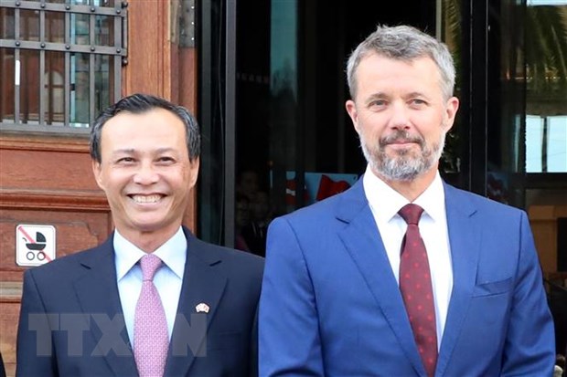Đại sứ Việt Nam tại Đan Mạch Lương Thanh Nghị và Thái tử kế vị Đan Mạch Frederik. Ảnh: Vũ Tùng/TTXVN |