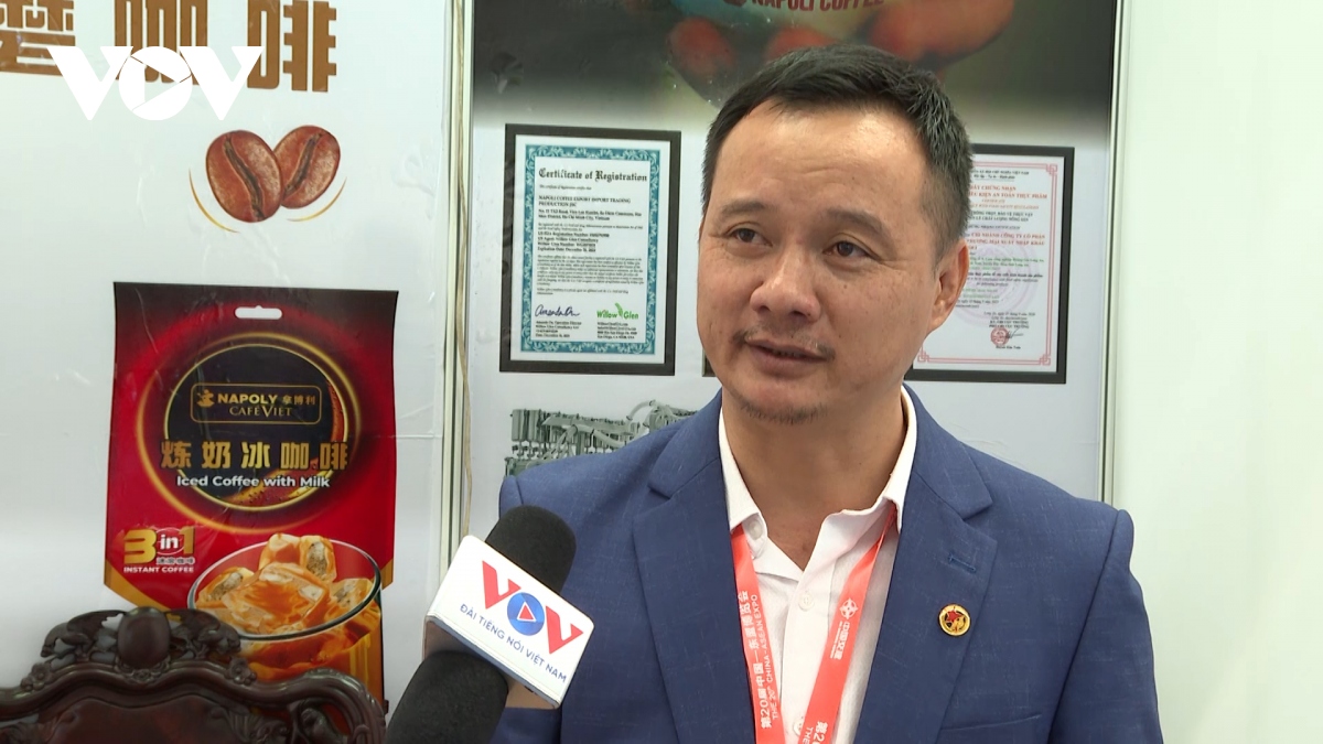 Nếu như sầu riêng tươi lần đầu xuất hiện, thì cà phê đã trở thành sản phẩm truyền thống của Việt Nam tại CAEXPO. Ông Nguyễn Đức Hùng, phụ trách gian hàng Napoli Coffee, cho biết: “Napoli cà phê Việt lần đầu tiên giới thiệu sản phẩm cà phê sạch, an toàn tới thị trường Trung Quốc. Chúng tôi dự kiến phát triển 25-30 nhà phân phối độc quyền tại Trung Quốc, nhằm giới thiệu mô hình cà phê sạch nhượng quyền của Napoli để người tiêu dùng Trung Quốc có thể thưởng thức rộng rãi.”