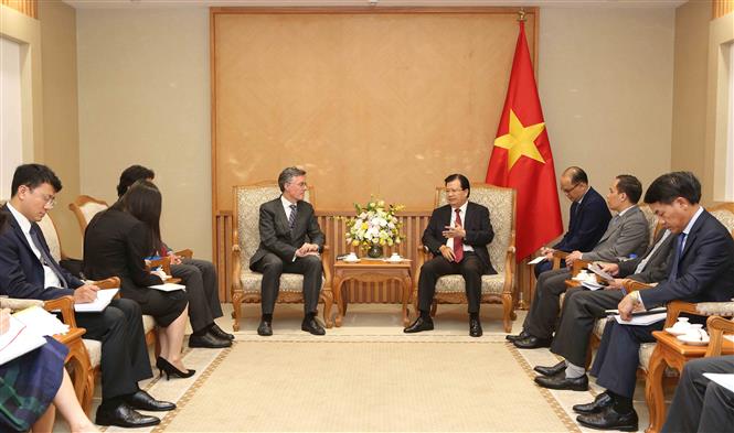 Phó Thủ tướng Trịnh Đình Dũng (phải) tiếp Phó Chủ tịch phụ trách Chính sách và Chiến lược của Ngân hàng Đầu tư Cơ sở hạ tầng châu Á (AIIB) Joachim Von Amsberg. -Ảnh: Dương Giang/TTXVN |
