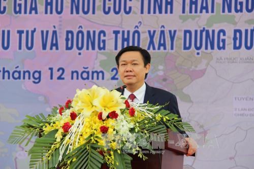 | Phó thủ tướng Vương Đình Huệ phát biểu tại lễ công bố quy hoạch tổng thể phát triển Khu du lịch quốc gia Hồ Núi Cốc, động thổ xây dựng đường Hồ Núi Cốc, Thái Nguyên. Ảnh: TTXVN |