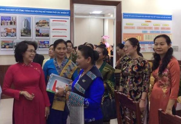 | Bà Tô Thị Bích Châu, Chủ tịch Hội liên hiệp phụ nữ thành phố Hồ Chí Minh hướng dẫn đoàn đại biểu Lào tham quan phòng truyền thống của Hội LHPN TP.HCM. |