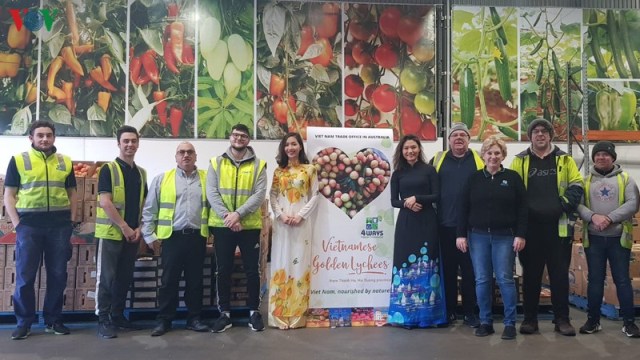 Trong khuôn khổ chiến dịch quảng bá xây dựng thương hiệu cho quả vải U-Hồng tại Australia với tên gọi là quả “vải vàng” (Golden lychee) may mắn, sáng 19/6, tại chợ đầu mối rau quả ở thành phố Adelaide, bang Nam Australia, Thương vụ Việt Nam tại Australia phối hợp với Công ty 4waysfresh quảng bá quả vải đối với các cửa hàng bán lẻ, siêu thị quan tâm, tiêu thụ vải Việt Nam.