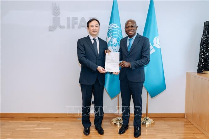 Đại sứ Dương Hải Hưng trình Ủy nhiệm thư đến Chủ tịch IFAD, ông Gilbert F. Houngbo. Ảnh: TTXVN |