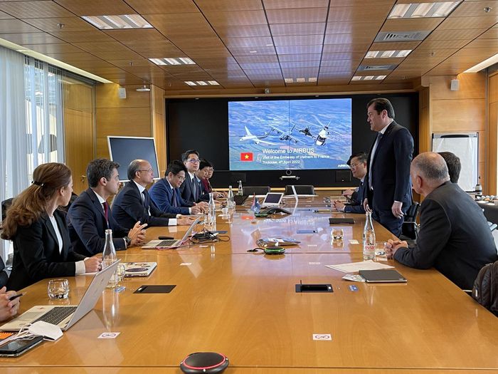Đại sứ Đinh Toàn Thắng làm việc với lãnh đạo Tập đoàn Airbus. Ảnh: Thu Hà/TTXVN |
