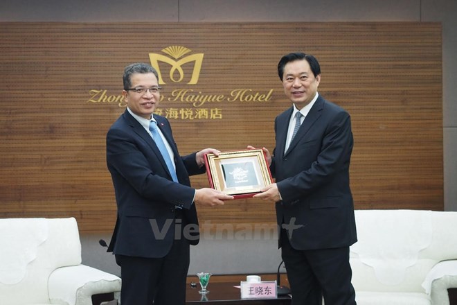 | Đại sứ Đặng Minh Khôi trao quà lưu niệm cho tỉnh Hà Bắc. (Ảnh: Lương Tuấn/Vietnam+) |