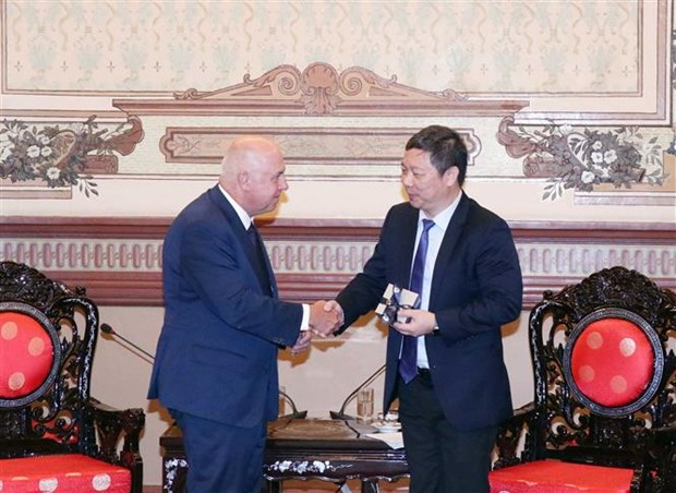 Ông Dương Anh Đức - Phó Chủ tịch Ủy ban Nhân dân Thành phố Hồ Chí Minh (phải) tiếp ông Tim Pallas - Bộ trưởng Ngân khố, Thương mại, Đầu tư và Lao động bang Victoria (Austrialia). Ảnh: Xuân Khu/TTXVN |