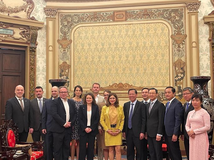 Chủ tịch UBND Thành phố Hồ Chí Minh Phan Phan Văn Mãi chụp ảnh lưu niệm cùng đoàn Thành phố Frankfurt. Ảnh: Xuân Mai/nld.com.vn |