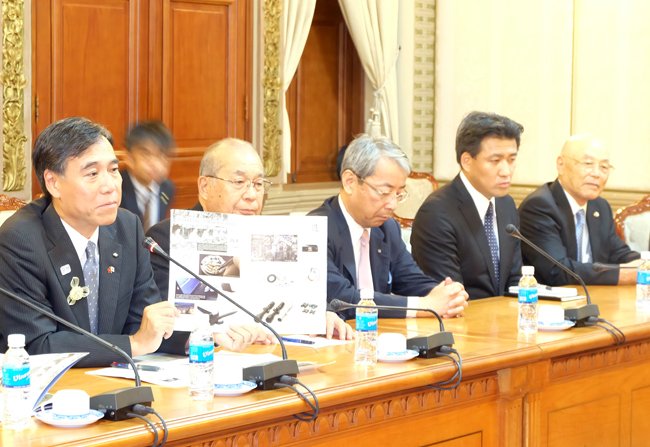 | Ông Shuichi Abe (bên trái ngoài cùng) chia sẻ thông tin về hoạt động của các doanh nghiệp chế tạo của tỉnh Nagano với lãnh đạo TPHCM -Ảnh: thesaigontimes |