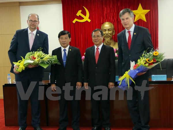 | Lãnh đạo tỉnh Bình Dương tặng hoa cho Thị trưởng hai thành phố Emmen và Hoovegeen. Ảnh: TTXVN |