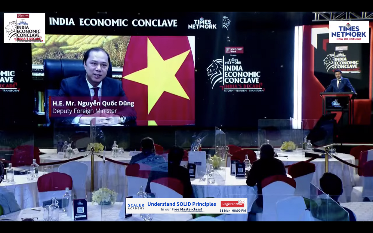Ngày 26/3, Thứ trưởng Ngoại giao Nguyễn Quốc Dũng tham dự Hội nghị Kinh tế Ấn Độ năm 2021 trực tuyến (India Economic Conclave, gọi tắt là IEC) chủ đề “Thập kỷ của Ấn Độ: Cải cách - Triển khai - Chuyển đổi”.