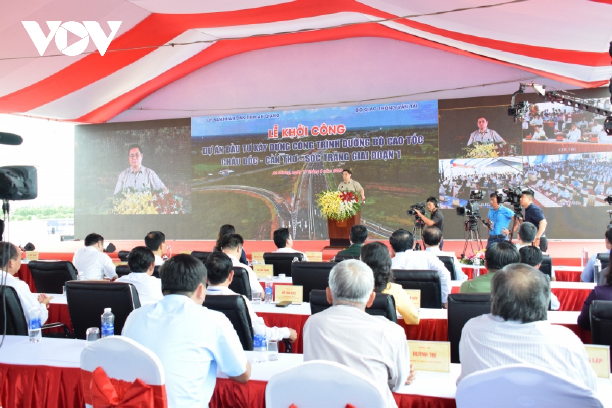 Phát biểu tại buổi lễ, Thủ tướng Phạm Minh Chính nhấn mạnh các tỉnh, thành phố: An Giang, Cần Thơ, Hậu Giang, Sóc Trăng, Ban quản lý dự án và các nhà thầu cần xây dựng kế hoạch, phương án thi công đảm bảo hiệu quả, chất lượng; bảo đảm tiến độ; phấn đấu cơ bản hoàn thành một số đoạn tuyến có lưu lượng giao thông lớn năm 2025, cơ bản hoàn thành toàn tuyến năm 2026 và hoàn thành đưa vào khai thác đồng bộ toàn Dự án năm 2027. Thủ tướng nhấn mạnh: Các địa phương cần rà soát, điều chỉnh các quy hoạch phát triển kinh tế - xã hội, gắn quy hoạch các khu kinh tế, khu công nghiệp, các khu đô thị, dân cư… với đường cao tốc. Chính phủ sẽ luôn dành sự quan tâm, chỉ đạo quyết liệt để hoàn thành Dự án này cũng như những Dự án đầu tư phát triển hạ tầng khác đúng tiến độ, chất lượng; đáp ứng nhu cầu phát triển kinh tế - xã hội, nâng cao đời sống của nhân dân.